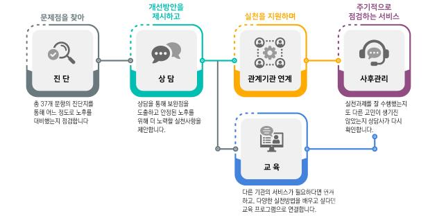 - 관계기관 연계 + 교육 (Connecting with Agencies + Education): 필요한 경우 관련 기관과 연결해 주며, 교육 프로그램을 제공합니다.