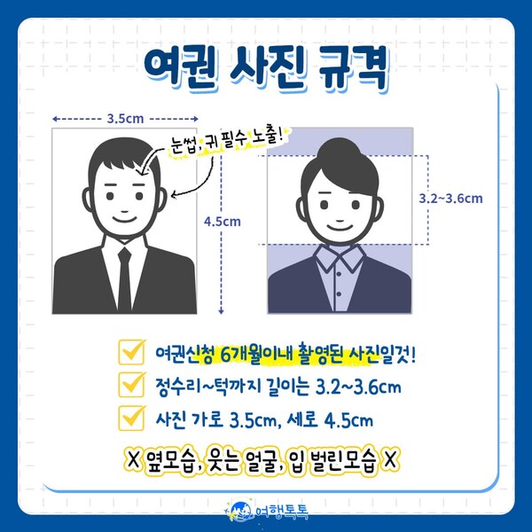 여권 발급 신청서와 사진은 반드시 준비해야 하며, 사진의 규격은 다음과 같습니다.