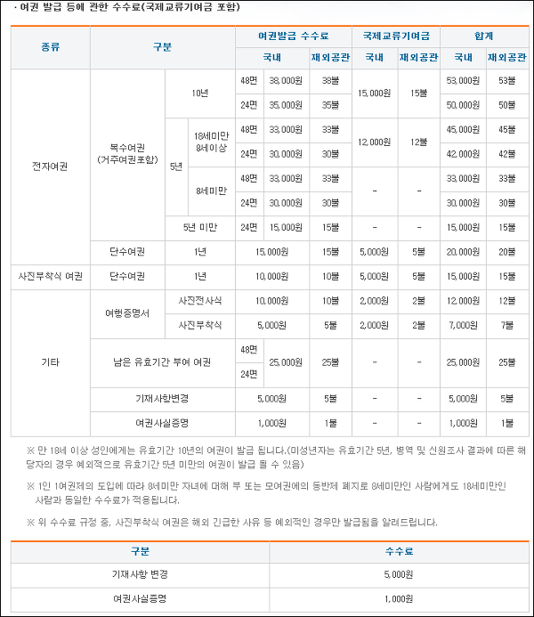 여권 발급 및 갱신에는 수수료가 발생합니다. 수수료는 여권의 종류에 따라 다르며, 일반적으로 전자여권과 일반 여권의 수수료가 다릅니다. 아래의 표를 참고하시기 바랍니다.