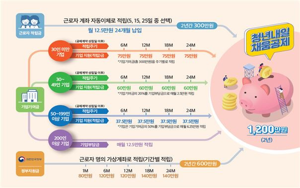 청년이 2년간 400만 원을 적립하면, 기업과 정부가 각각 400만 원을 추가로 지원해 총 1,200만 원을 수령할 수 있습니다.